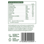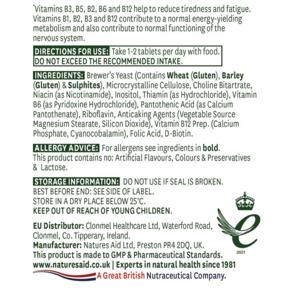 | Sestava | Pivski kvas (vsebuje pšenico (gluten), ječmen (gluten) in sulfit), mikrokristalna celuloza, holin bitartrat, niacin (kot nikotinamid), inozitol, tiamin (kot hidroklorid), vitamin B6 (kot piridoksin hidroklorid), pantotenska kislina (kot kalcijev pantotenat), riboflavin, sredstva proti strjevanju (rastlinski magnezijev stearat, silicijev dioksid), vitamin B12 (kalcijev fosfat, cianokobalamin), folna kislina, D-biotin. 1 tableta zagotovi: 5 mg tiamina (455% PDV*), 5 mg riboflavina (357% PDV*), 25 mg niacina (156% PDV*), 5 mg vitamina B6 (357% PDV*), 200 mcg folne kisline (100% PDV*), 5 mcg vitamina B12 (200% PDV*), 75 mcg biotina (150% PDV*), 5 mg pantotenske kisline (83% PDV*), 20 mg holina, 20 mg inozitola. Ne vsebuje mlečnih izdelkov, soje in oreščkov ter je primeren za vegane. |
