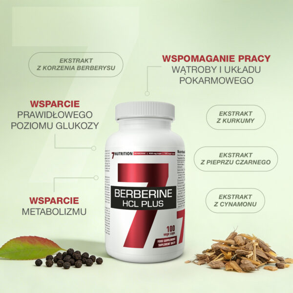 7Nutrition Berberine HCl Plus je prehransko dopolnilo, ki temelji na skrbno izbrani kombinaciji rastlinskih sestavin, ki so bile predmet obsežnih znanstvenih raziskav že vrsto let v kontekstu presnove ogljikovih hidratov in lipidov ter splošne presnovne homeostaze. Formula izdelka združuje izvleček korenine berberina z izvlečki cimeta, kurkume in črnega popra.