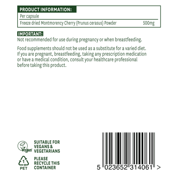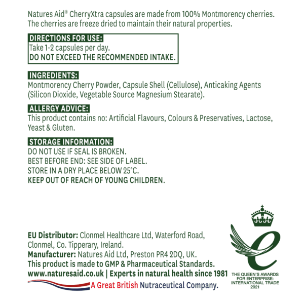 V podjetju Natures Aid naša CherryXtra vsebuje 500 mg liofilizirane višnje Montmorency v prahu in je za vaš mir izdelana v skladu s standardi GMP.