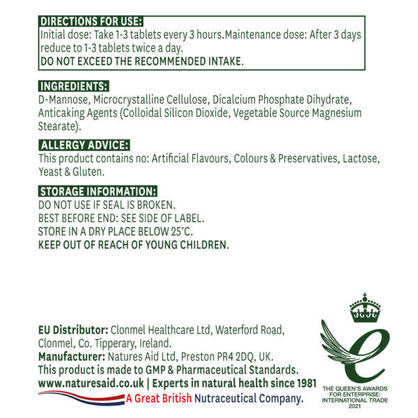 Tablete Natures Aid D-manoza vsebujejo kar 1000 mg D-manoze in ne vsebujejo laktoze in glutena ter so primerne za vegane D-manoza je postala zelo priljubljena zaradi svojih potencialnih koristi za zdravje, zlasti za zdravje sečil.