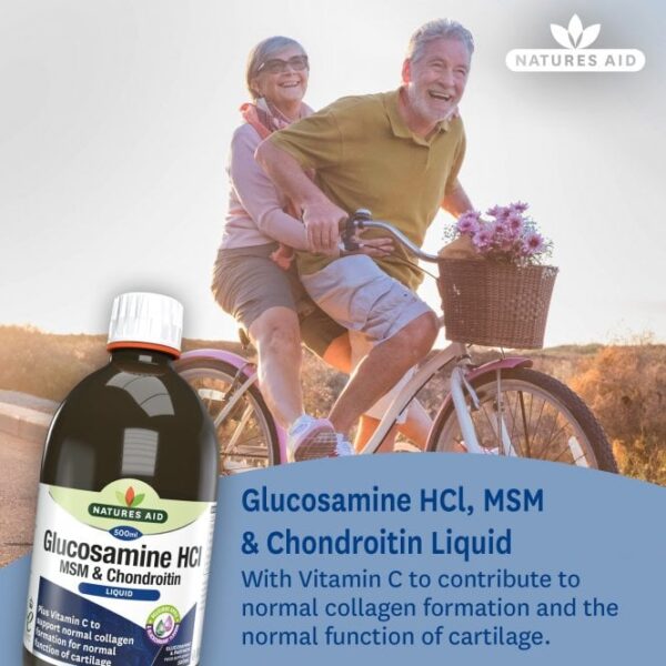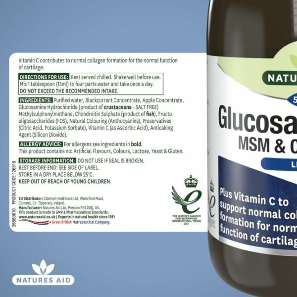 Natures Aid Glukozamin, hondroitin in MSM v tekoči obliki sta alternativa tabletam in vsebujejo 1500 mg glukozamina, 500 mg MSM in 400 mg hondroitina z vitaminom C.