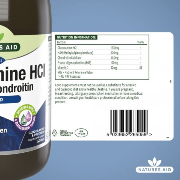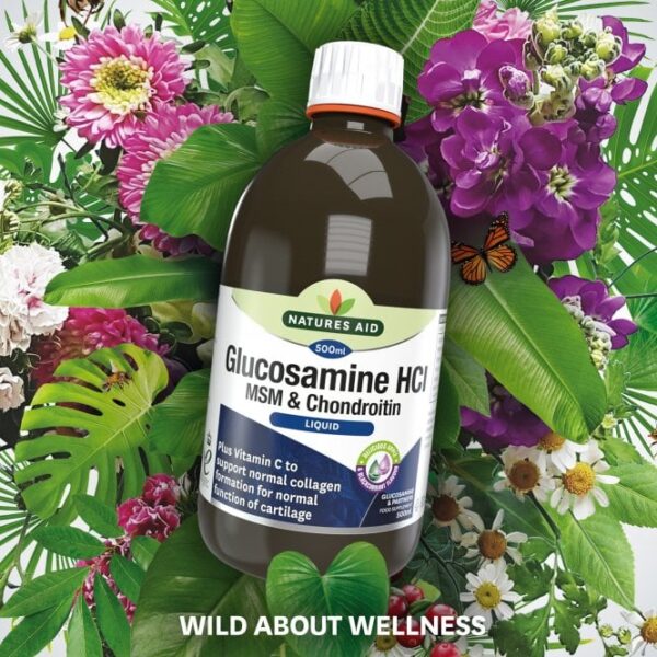 Natures Aid Glukozamin, hondroitin in MSM v tekoči obliki je alternativa tabletam in vsebuje 1500 mg glukozamina, 500 mg MSM in 400 mg hondroitina z vitaminom C.