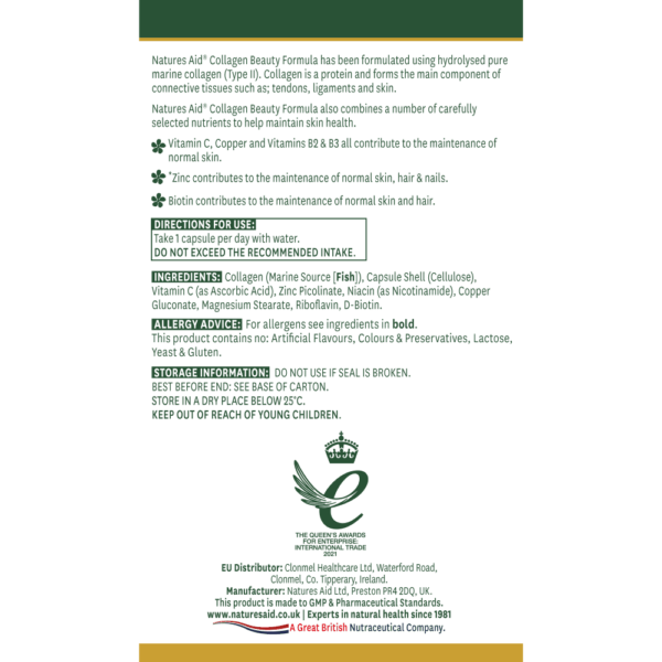 V podjetju Natures Aid se zavedajo, da lahko življenje včasih prepreči popolno prehrano. Kolagensko formulo za lepoto je ustvarila ekipa prehranskih strokovnjakov, da bi zagotovila 500 mg hidroliziranega kolagena morskega izvora v kombinaciji s posebej izbranimi hranilnimi snovmi, vključno z: