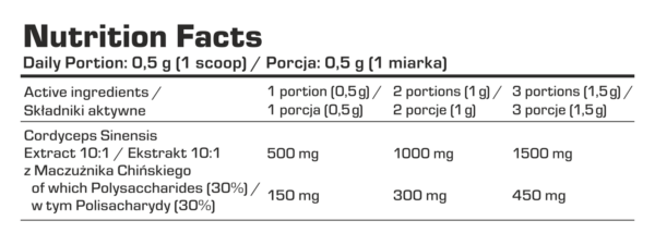 | Sestava | 10:1 izvleček gobe Cordyceps sinensis, standardiziran tako, da vsebuje >30 % polisaharidov. 1 odmerek zagotovi 500 mg ekstrakta Cordyceps, od tega 30 % (150 mg) polisaharidov. |
