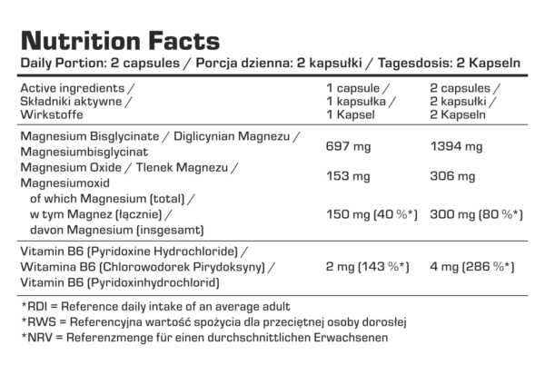| Sestava | magnezijev bisglicinat; vitamin B6 (piridoksin hidroklorid); celulozna kapsula (HPMC). 2 kapsuli vsebujeta 1394 mg. bisglicinata ter 306 mg mg. oksida, kar zagotovi 300 mg magnezija (80% PDV*). |