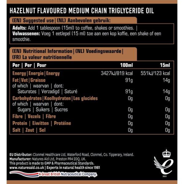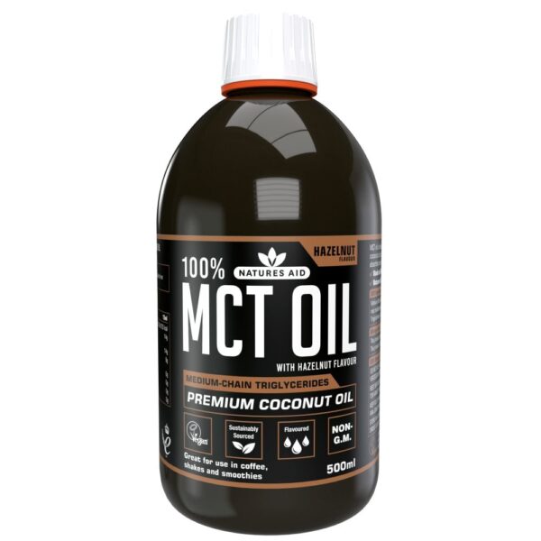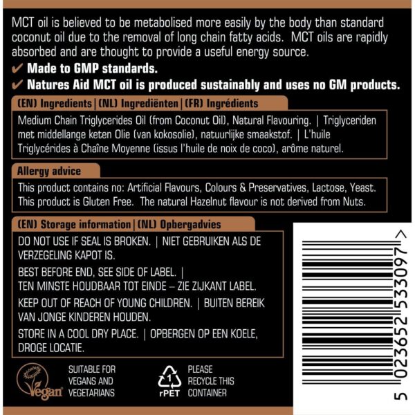 MCT olje je prehransko dopolnilo, ki je vir srednjeverižnih maščobnih kislin. To je visokokakovostno, 100-odstotno čisto in naravno kokosovo olje z aromo lešnika. Olje Natures Aid® MCT je izdelano v Združenem kraljestvu po najvišjih standardih GMP.