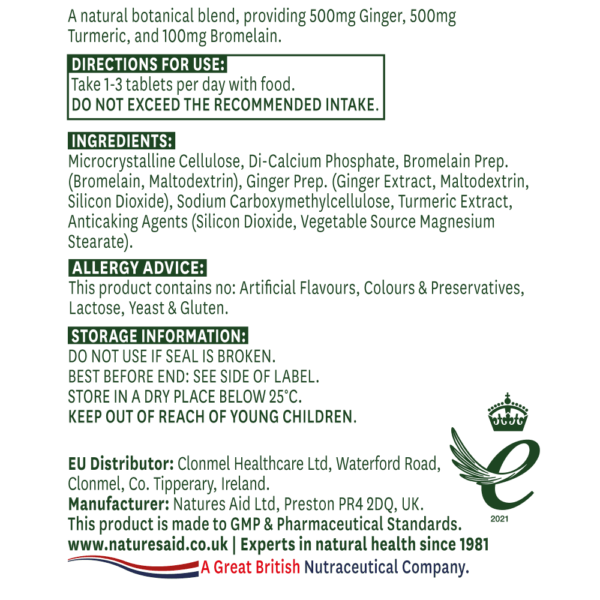 Natures Aid Ingver, kurkuma in bromelain (protivnetna formula), 60 tablet