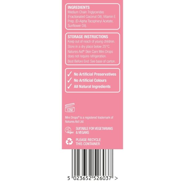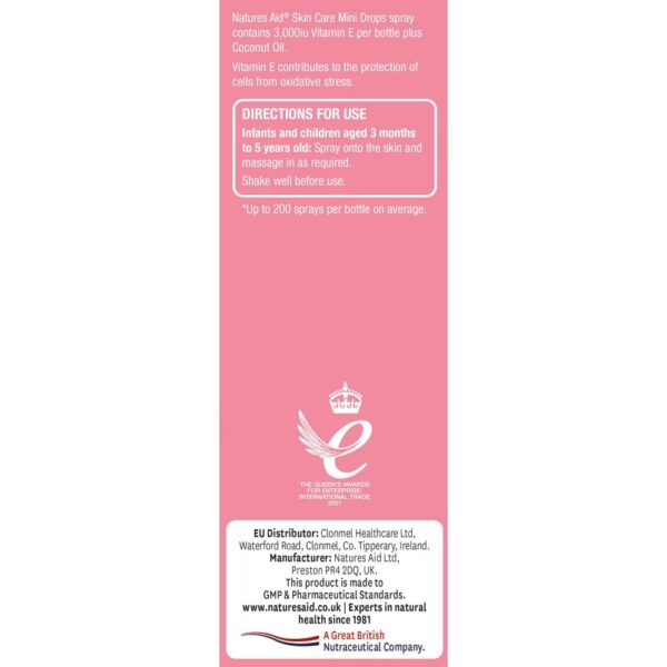 Vsaka steklenička Natures Aid Mini Drops Skin Care pršila za nego nežne otroške kože vsebuje 3.000IU naravnega vitamina E na osnovi srednjeverižnih trigliceridov (frakcionirano kokosovo olje).