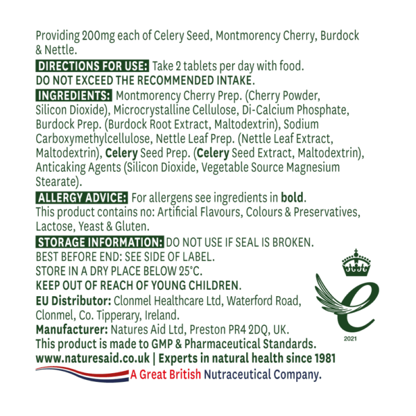| Sestava | Pripravek češenj Montmorency (češnja v prahu, silicijev dioksid), mikrokristalna celuloza, di-kalcijev fosfat, pripravek repinca (izvleček korenine repinca, maltodekstrin), natrijeva karboksimetilceluloza, pripravek iz listov koprive (izvleček listov koprive, maltodekstrin), pripravek iz semen zelene (izvleček semena zelene, maltodekstrin), sredstva proti sprijemanju (silicijev dioksid, magnezijeve soli maščobnih kislin rastlinskega izvora). |