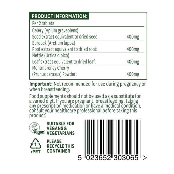 Ta edinstvena kombinacija zagotavlja izvlečke, enakovredne 200 mg posušenega semena zelene, 200 mg posušene korenine repinca, 200 mg posušenega lista koprive in 200 mg izvlečka češnje Montmorency. Tablete so primerne za vegane in ne vsebujejo laktoze, pšenice ali glutena.
