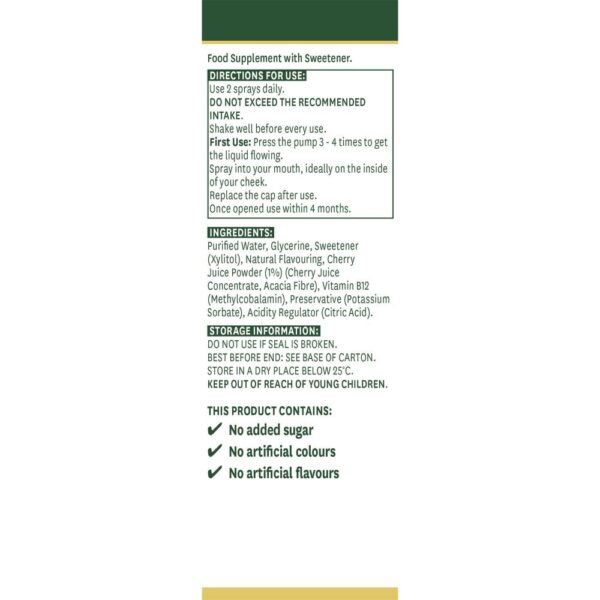 | Uporaba | Uporabite 2 razpršili dnevno. Pred vsako uporabo dobro pretresite. Prva uporaba: pritisnite pumpico 3- do 4-krat, da tekočina začne teči. Razpršite v usta, najbolje na notranjo stran lica. Po uporabi namestite pokrovček. Po odprtju porabite v 4 mesecih. Priporočene dnevne količine se ne sme prekoračiti. Prehransko dopolnilo ni nadomestilo za uravnoteženo in raznovrstno prehrano in zdrav način življenja. Varnostne informacije |