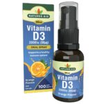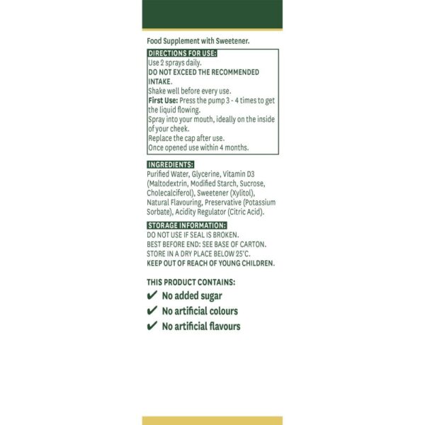 Natures Aid Vitamin D3 ustno pršilo je priročna in okusna alternativa tabletam. Samo 2 potiska na pumpico vam zagotovita odmerek 2000IU (1000 % PDV*) s 100-dnevno zalogo v vsakem pakiranju. Primerno za vegetarijance in ne vsebuje umetnih barvil ali arom.