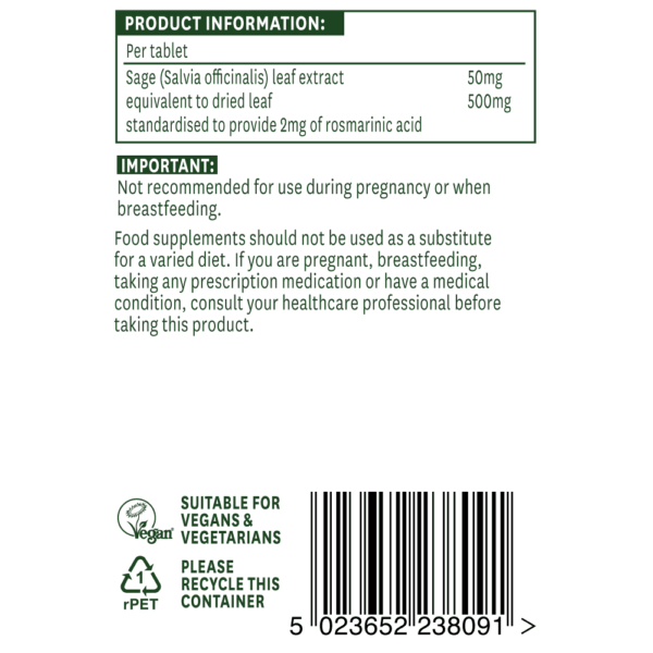 Tablete z žajbljevimi listi vsebujejo 50 mg izvlečka, kar ustreza 500 mg posušenih žajbljevih listov. Vsaka tableta zagotavlja 2 mg rožmarinskih kislin. Te tablete prav tako ne vsebujejo tujona, sestavine žajblja, ki se ne sme redno uživati. Tablete so primerne za vegane ter ne vsebujejo laktoze, pšenice in glutena.
