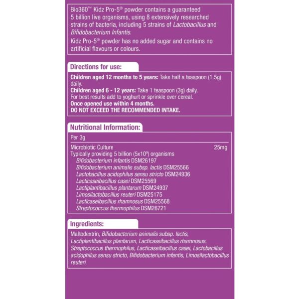 Ti nagrajeni in za uporabo enostaven prašek Kidz Pro-5 vsebuje 5 milijard živih organizmov in 8 sevov bakterij, ki so jih skrbno izbrali naši strokovnjaki. To so Bifidobacterium lactis, Lactiplantibacillus plantarum, Lacticaseibacillus rhamnosus, Streptococcus thermophilus, Lacticaseibacillus casei, Lactobacillus acidophilus sensu stricto, Bifidobacterium infantis in Limosilactobacillus reuteri.