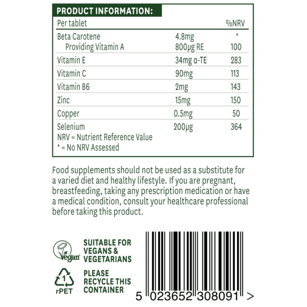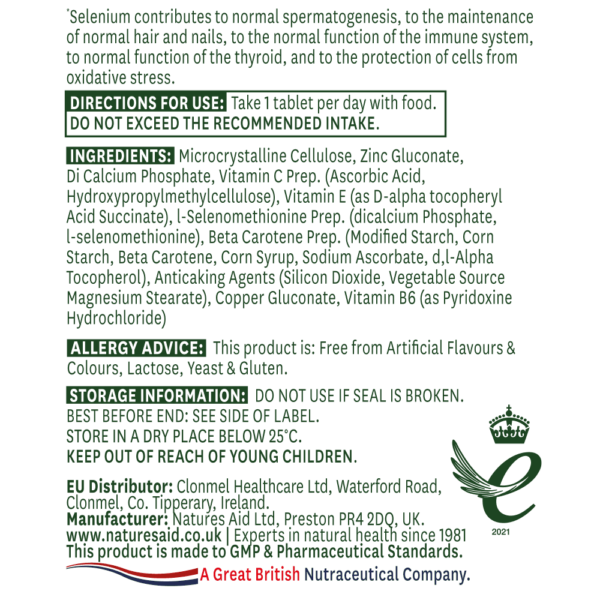 Naš dodatek s selenom Natures Aid vsebuje 200 µg selena na tableto. Naši notranji strokovnjaki so združili selen z dodatnimi hranili v edinstveno in priročno dnevno dopolnilo; vključili smo vitamin A v obliki beta karotena, vitamin C in vitamin E ter cink v obliki, primerni za vegane.