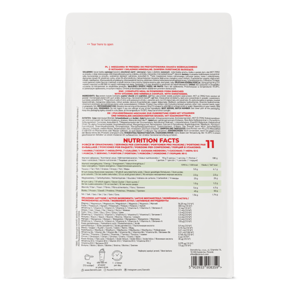 | Sestava | SOJIN beljakovinski izolat (vsebuje ŽVEPLOV DIOKDIS in SULFITE), OVSENA moka, izolat grahovih beljakovin, bučna semena, aroma, MCT olje (70 %) iz kokosovega olja v mikroenkapsulirani obliki z arabsko gumo, mešanica mikrohranil**, OVSENA vlakna, liofilizirane jagode, koncentrat rdečega pesnega soka v prahu, sladila: sukraloza, acesulfam K. 1 obrok vsebuje: Lahko vsebuje sledove mleka (vključno z laktozo), soje, arašidov in drugih oreščkov, sezama, glutena, žitaric, zelene, gorčice, jajc, lupinarjev, rib. |