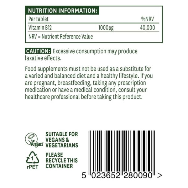 Pri Natures Aid so naše tablete Vitamin B12 Sublingual 1000mcg skrbno pripravili naši strokovnjaki za prehrano. Vsaka priročna tableta vsebuje 1000 μg vitamina B12 v obliki metilkobalamina in je zasnovana tako, da se počasi raztaplja pod jezikom, namesto da bi jo pogoltnili, s čimer zaobide prebavni sistem, zato je izdelek primeren tudi za tiste, ki jemljejo antacidne tablete.