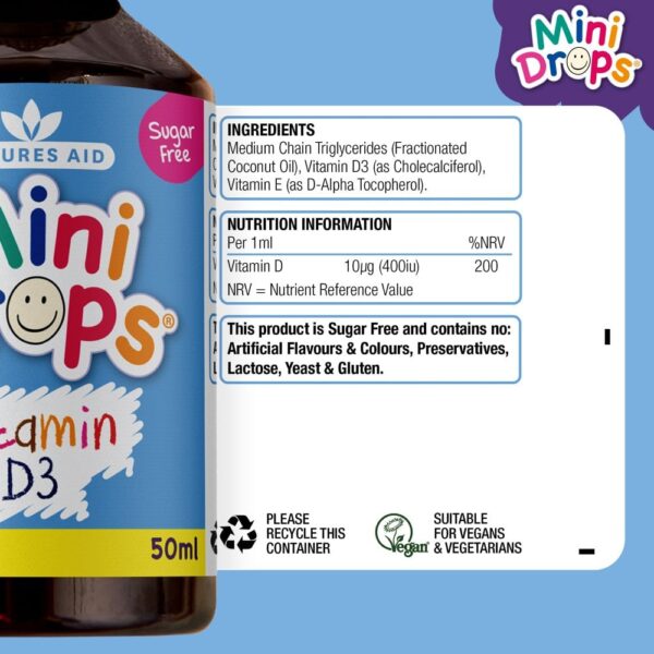 Natures Aid® Vitamin D3 kapljice za otroke so vrhunske kapljice za dojene otroke, dojenčke in otroke, ki so prejele nagrado za svojo izjemno kakovost! Vitamin D je esencialnega pomena za telo, saj je nujno potreben, da telo absorbira kalcij za močne in zdrave kosti in zobe. To je še posebej pomembno za dojenčke in otroke, saj ti intenzivno rastejo in pomanjkanje lahko pusti nepopravljive posledice.