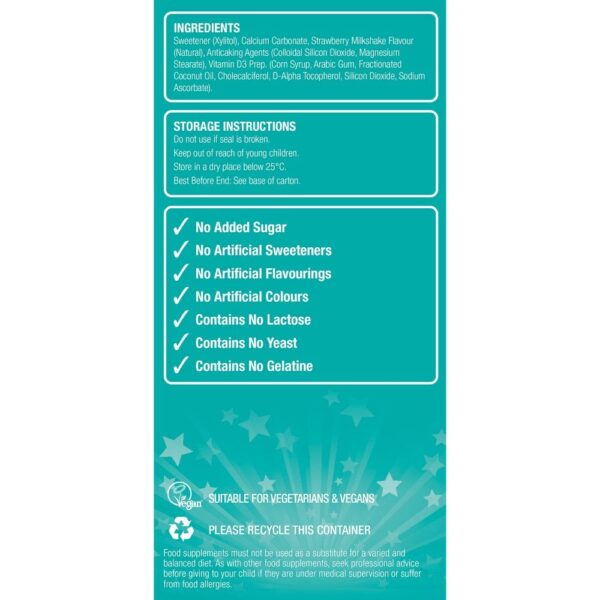 | Sestava | Sladilo (ksilitol), kalcijev karbonat, aroma jagodnega napitka (naravna), sredstva proti strjevanju (koloidni silicijev dioksid, magnezijev stearat), pripravek vitamina D3 (koruzni sirup, arabski gumi, frakcionirano kokosovo olje, kolekalciferol, D-alfa-tokoferol, silicijev dioksid, natrijev askorbat). Primerno za vegane in vegetarijance. Ne vsebuje: gensko spremenjenih sestavin, umetnih barvil, umetnih arom, mleka, laktoze, glutena, pšenice, kvasa, oreščkov, soli, soje, škroba, želatine in dodanega sladkorja. |